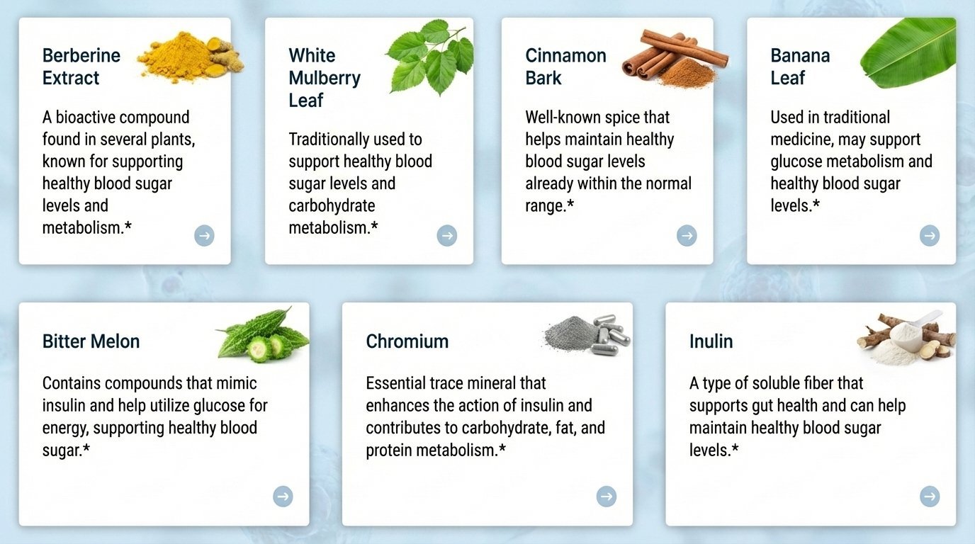 White Mulberry Leaf inhibits alpha glucosidase, the digestive enzyme responsible for breaking down complex carbohydrates into glucose, effectively slowing the sugar absorption rate after meals and preventing the sharp post meal spikes that drive cravings, fatigue, and fat storage. Banaba Leaf, rich in corosolic acid, facilitates glucose transport into cells similarly to insulin, while Bitter Melon provides plant based compounds that mimic insulin activity and support glucose metabolism at the cellular level. Chromium amplifies insulin action to ensure glucose enters cells efficiently, and Inulin fiber slows digestion further while nourishing the gut microbiome, which plays an increasingly recognized role in metabolic health and glucose regulation.
